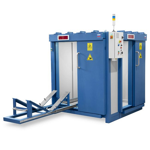 Конструкция защитной камеры выполнена из стали и свинца, имеет две сдвижные двери: одна — для позиционирования рентгеновского аппарата на манипуляторе относительно объекта контроля, вторая — для загрузки контролируемого изделия на выдвижном ложементе.